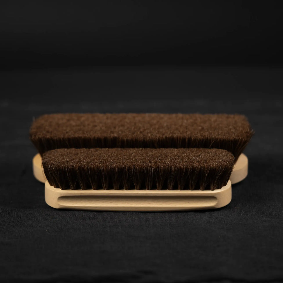 Ideal for gentle polishing and dust removal, this brush is perfect for eliminating surface dust from leather. It is designed with a varnished beechwood handle and soft horsehair bristles, providing an effective yet delicate touch.